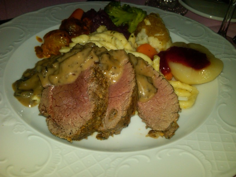 Elk Loin with Mushroom Sauce, Spaetzle, Red Cabbage and Brussle Sprouts