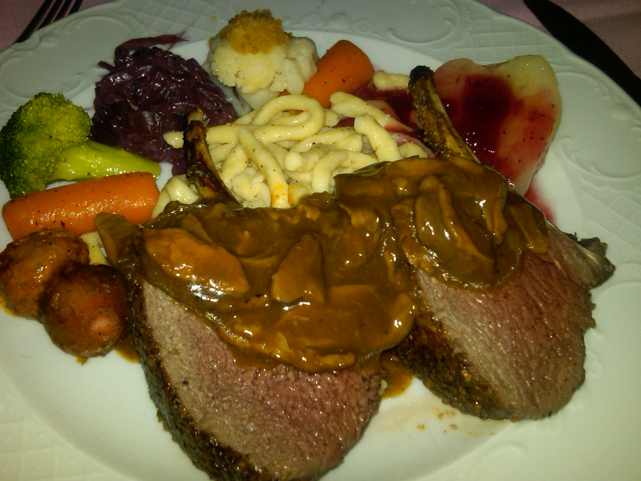 Rack of Caribou with Mushroom Sauce, Spaetzle, Red Cabbage and Brussle Sprouts